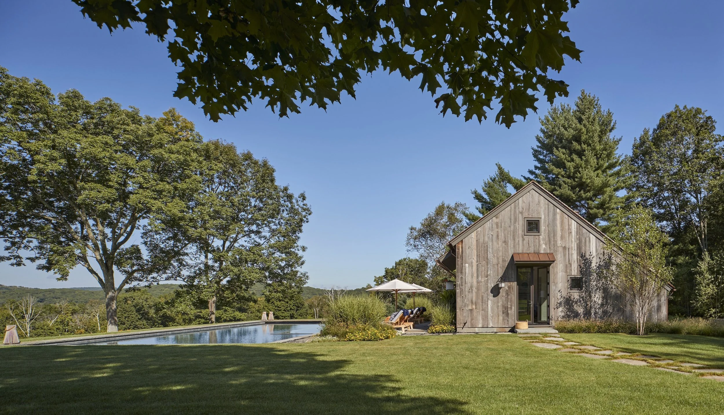 The design of a pool house can be inspired by its surroundings. This saltbox form pool house with antique weathered siding was designed to recall the barns and sheds of its rural setting.