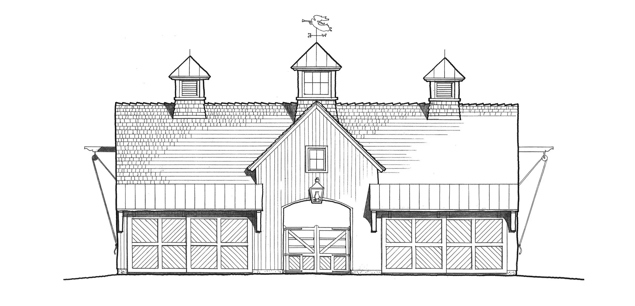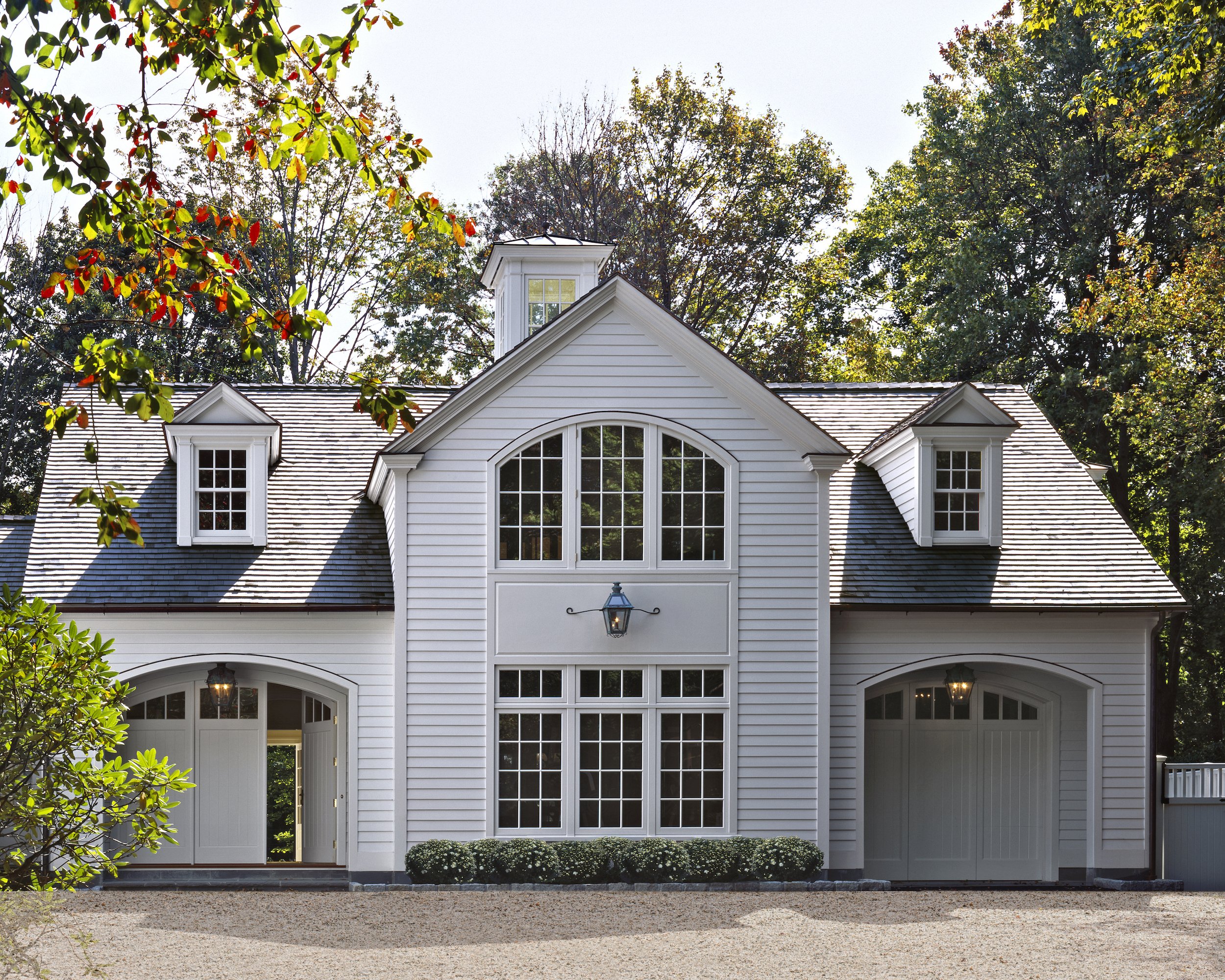 Often an outbuilding can be designed to accommodate multiple uses. The lower level of this new barn-like structure houses the family’s automobiles, recreational vehicles, and garden equipment. The upper level is an open loft with a cathedral ceiling, providing a flexible, spacious guest suite complete with a full bath and pantry.