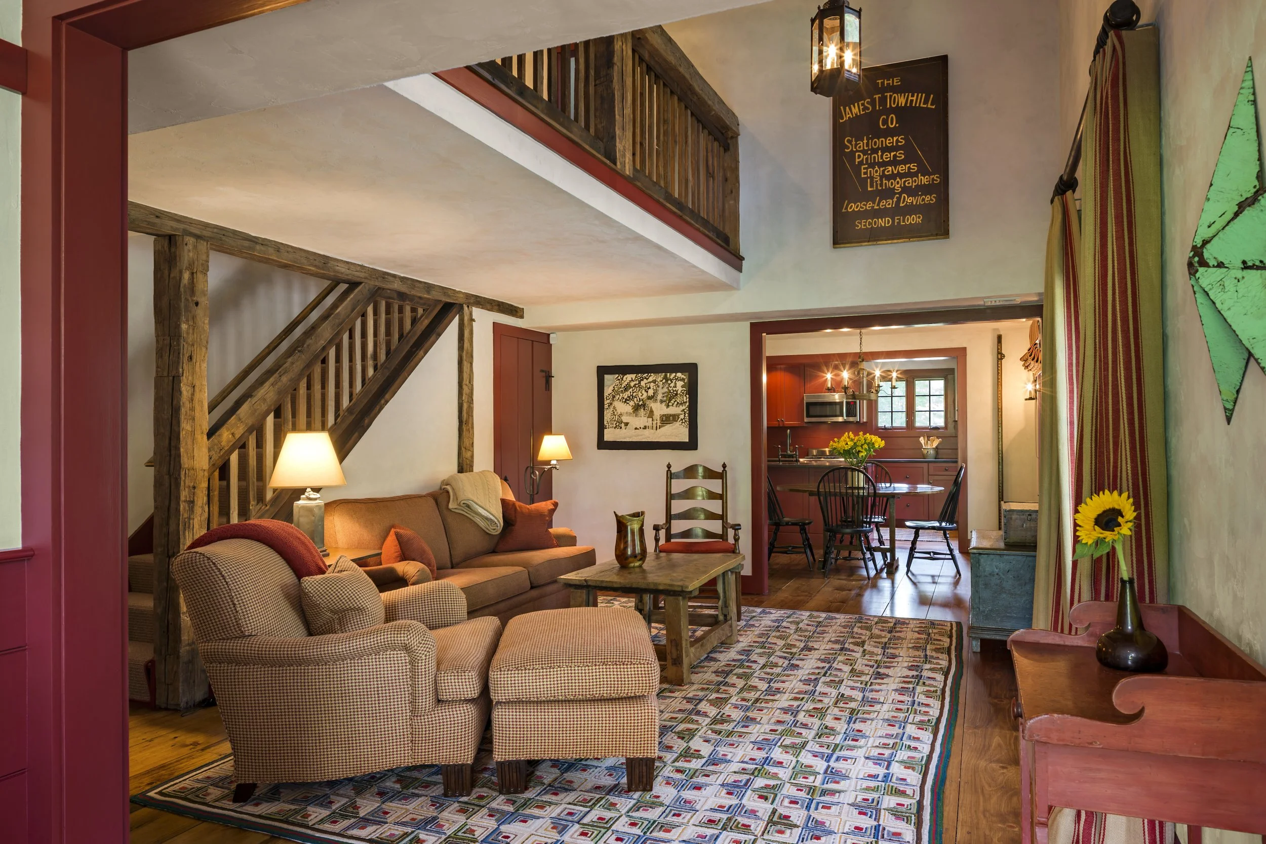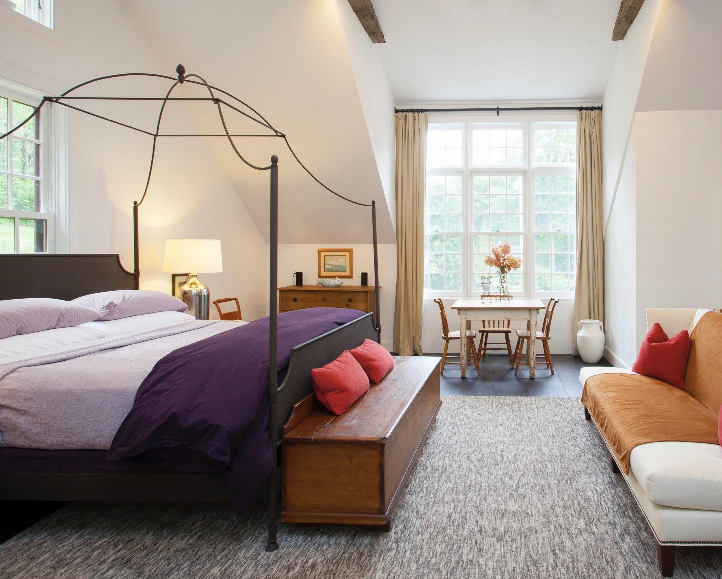 This 19th century stable was repurposed as a guest house. With four compact bedrooms, a full kitchen and a comfortable living area it can accommodate a visiting family for a long stay. The original hand-hewn timbers are featured on the interior, complemented by rustic antiques.