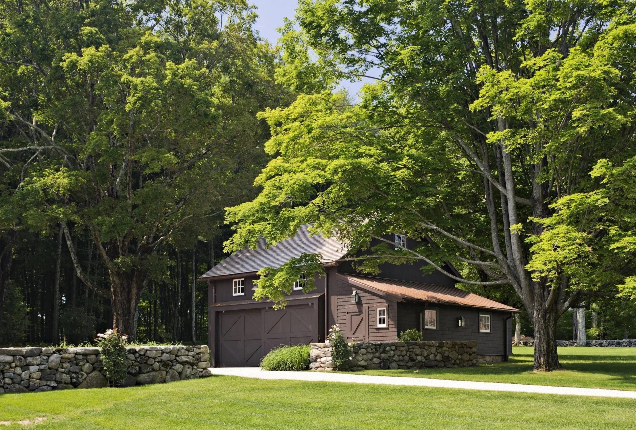 Historically, agrarian buildings on New England working farms were clustered together for convenience. This grouping of three farm buildings defines a central courtyard. They are painted a dark chocolate to accentuate their simple sculptural forms.