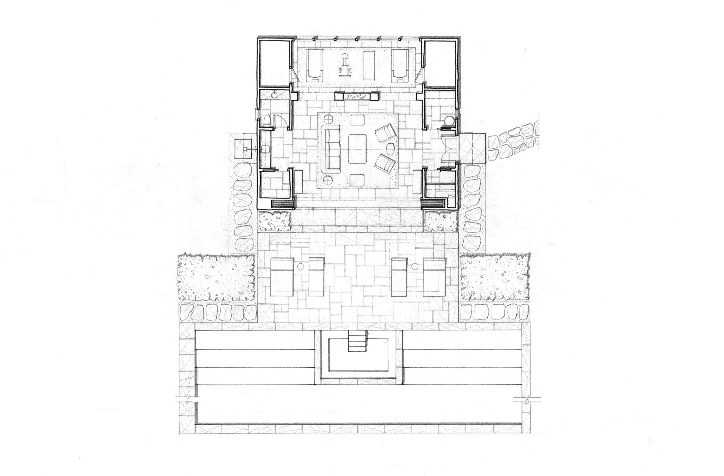 On a large country property, a distant swimming pool can be a wonderful destination, providing a unique private environment, out of view of the main house. Creating a well-equipped pool house to serve a destination pool allows a relaxing afternoon by the pool, without trips back to the main house.