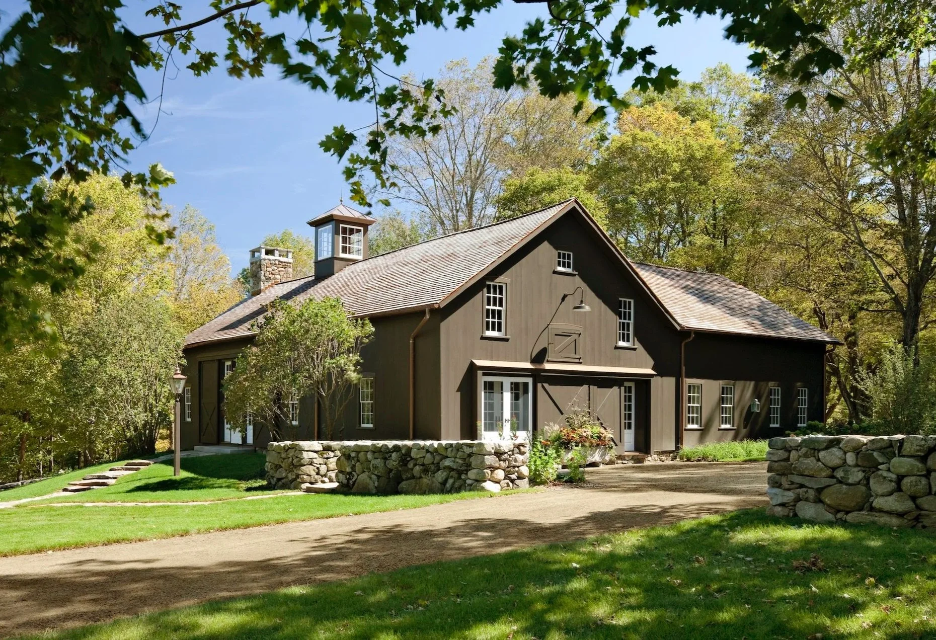 To complement the entertainment barn, a small barn to house classic cars was created using hand-hewn antique timbers and salvaged wood planking. A low fieldstone wall links this barn to the entertainment barn, defining the fourth side of the courtyard.