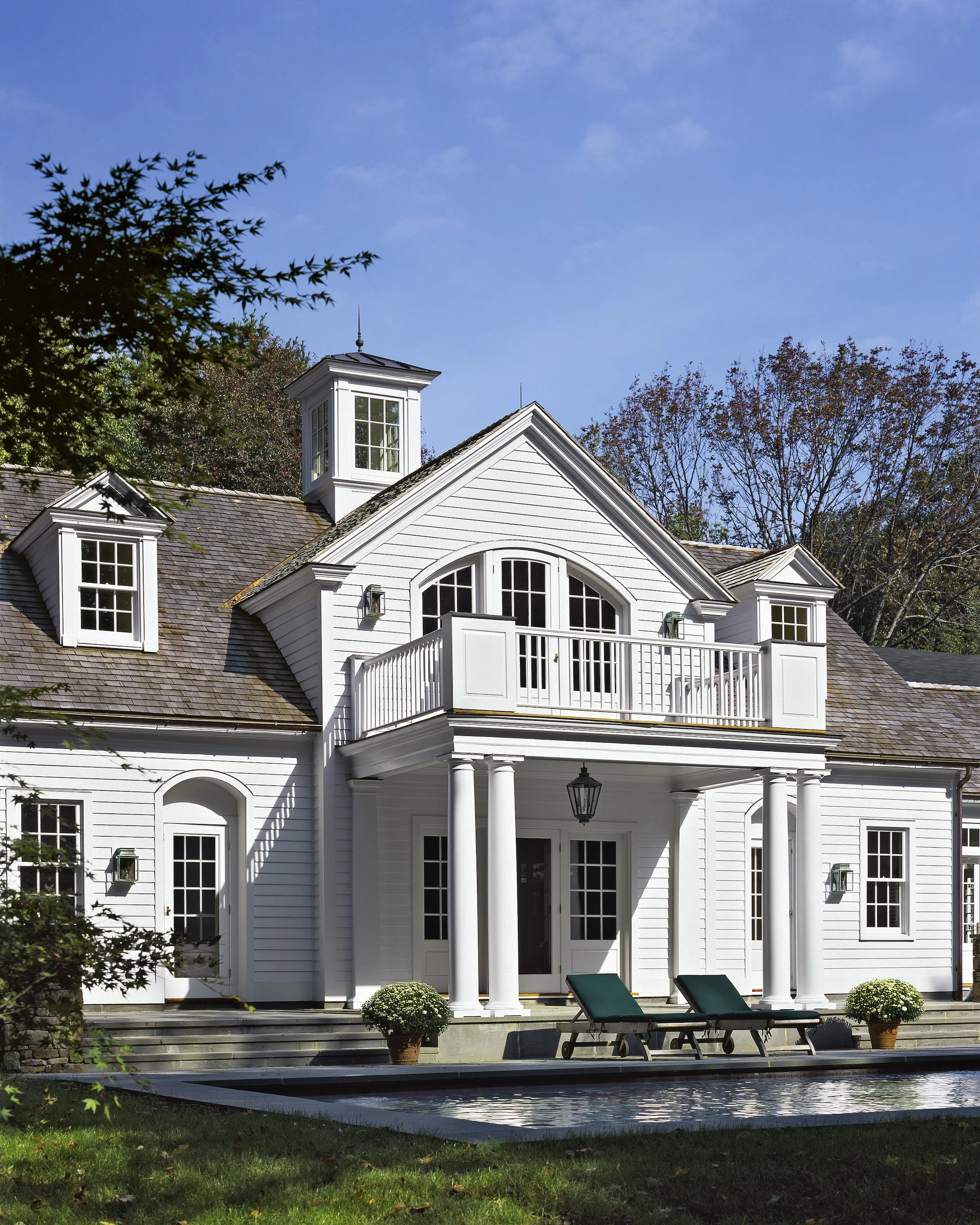A pool house can serve multiple uses. This Neoclassical pool house serves as a carriage house on the courtyard side. The first floor accommodates a large gym, pantry, bathroom, solarium, and covered porch. Guest bedrooms on the second floor share a balcony overlooking the pool.