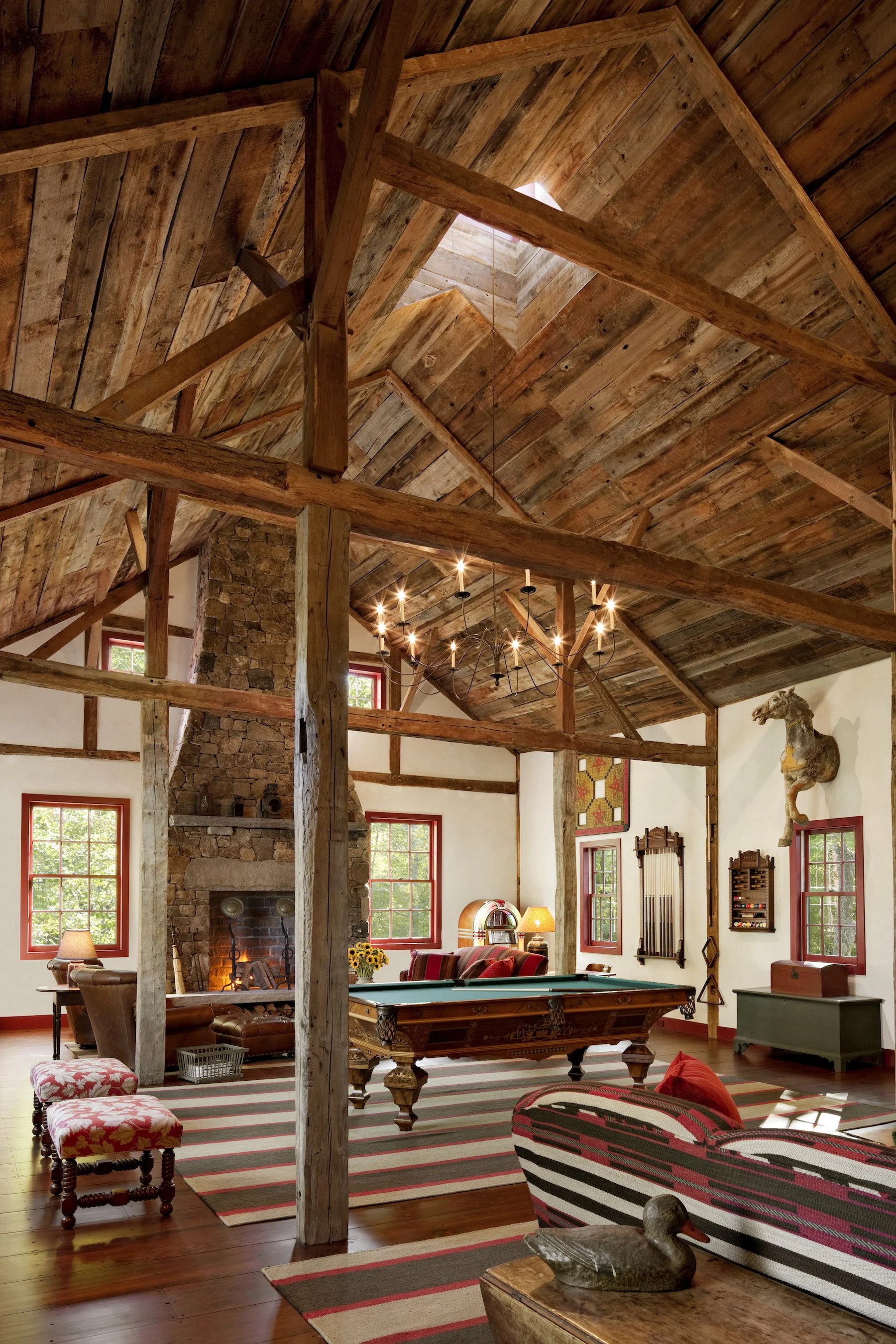 Finding new uses for existing farm buildings is key to their survival. The largest building of this cluster is a 19th century barn which has found new life as an entertainment barn, featuring a large billiard room, pub, game arcade, and theater. It’s a favorite family destination, allowing for raucous fun, without disturbing the main house.